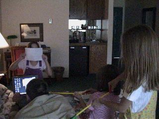 The girls are enjoying bugging their father with the toys they bought from Santa Cruz. Nicole, being as creative as she is made a monster face to scare Daddy. Daddy is trying to upload the latest update to the web site without too much luck. The phone line has finally been fixed!
